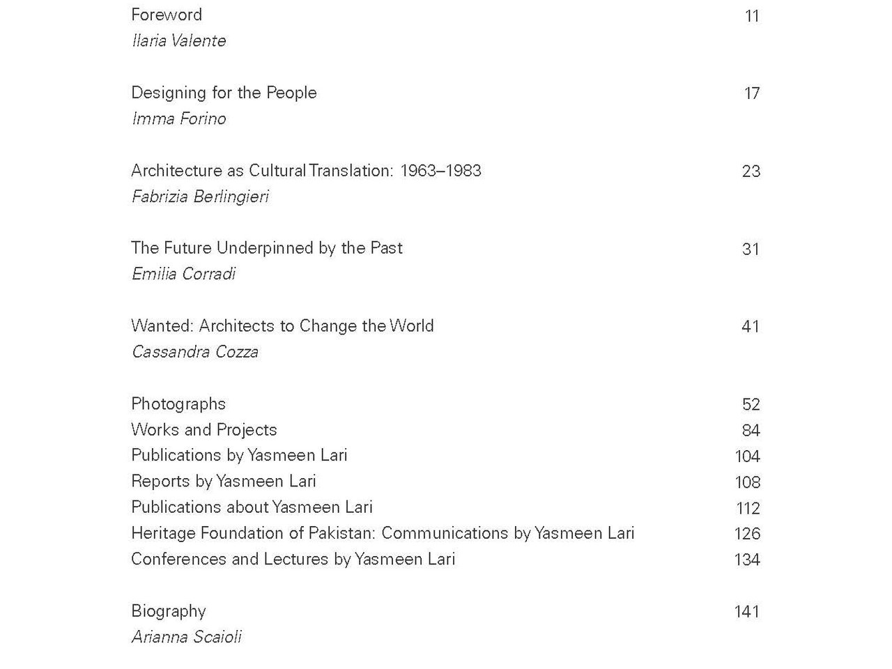 La monografia Yasmeen Lari. An architect nasce in occasione del conferimento della Laurea Magistrale ad honorem in Architettura e Ingegneria Edile-Architettura da parte della Scuola AUIC Architettura, Urbanistica, Ingegneria e Costruzioni del Politecnico di Milano.